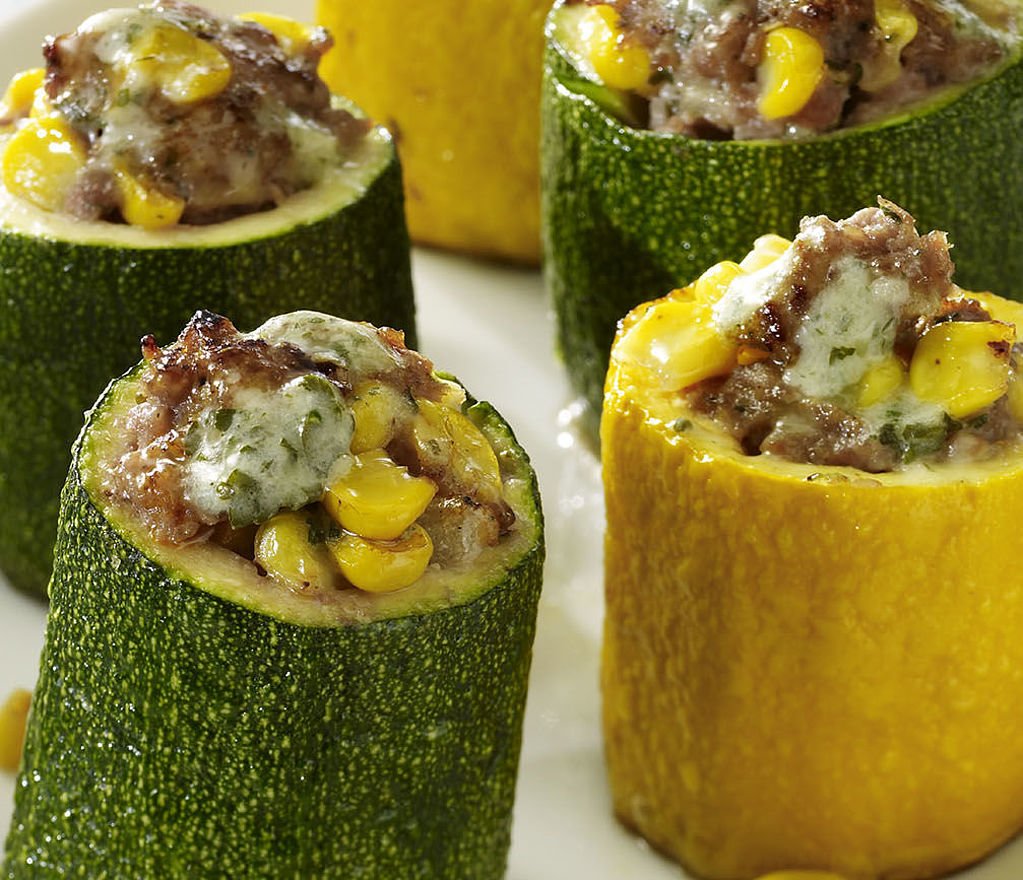 Maïs laten uitlekken. Ui pellen en in fijne blokjes snijden. Gehakt met maïskorrels, ui en zachte boter kneden, met peper en weinig zout kruiden. Courgettes wassen, schoonmaken en telkens in 4 stukken snijden. Met een mes de courgettes uithollen, daarbij een rand laten staan. Gehaktmassa in de courgettes doen en vervolgens in een ovenschaal plaatsen. 300 ml heet water met bouillon erdoor roeren en in de schaal gieten. In een voorverwarmde bakoven (elektrisch fornuis: 200°C/circulatielucht: 175°C/gas: niveau 3) 25-30 minuten lang gaar laten worden. Met basilicum garneren. Daarbij smaakt een Meggle baguette.