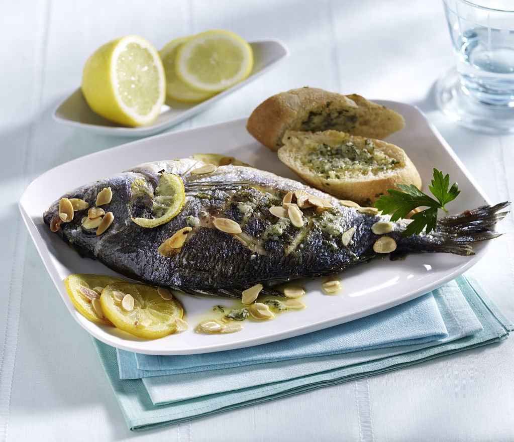 Amandelschilfers in een pan zonder vet goudbruin roosteren, uitnemen en laten afkoelen. 60 g kruidenboter in stukjes snijden. Citroen grondig wassen, afdrogen en in stukjes snijden. Dorades aan binnen—en buitenzijde wassen, droogdeppen. Met een scherp mes aan elke zijde meermaals insnijden. Dorades met amandelschilfers, stukjes citroen en boter vullen. De roosters of aluminium schotels met olie bestrijken. De vissen erin leggen. Op de hete grill 12-15 minuten lang zonder omdraaien (in de grillschotel slechts één keer na de helft van de grilltijd omdraaien) grillen. Baguette in de voorverwarmde bakoven (elektrisch fornuis: 175°C/circulatielucht: 150°C/gas: niveau 2) 8-10 minuten lang, al naargelang de gewenste bruine kleur, bakken. 65 g zachte kruidenboter op het einde van de grilltijd op de dorades strijken. Dorades met baguette opdienen. Met peterselie garneren.