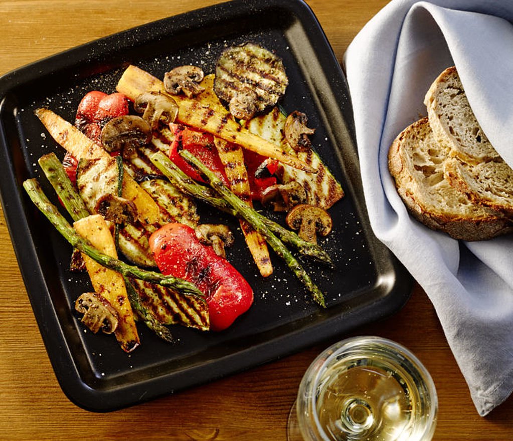 Nu alle stukjes groenten met een beetje kruidenboter bestrijken. In een aluminium schotel met de resterende kruidenboter ca. 15 minuten lang grillen totdat er donkere roostersporen zichtbaar zijn. Tussendoor één keer omdraaien.
