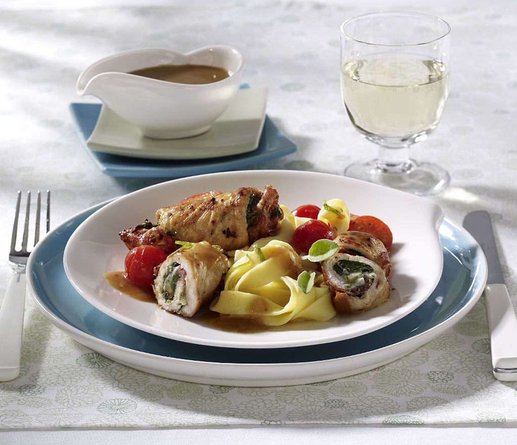 In de voorverwarmde bakoven (elektrisch fornuis: 200°C/circulatielucht: 175°C/gas: niveau 3) 8-10 minuten laten garen. Vervolgens de deegwaren in kokend zoutwater, volgens de instructies op de verpakking, bereiden. Het braadvet nog eens verhitten en de salie daarin even bakken. Witte wijn en 200 ml water erbij gieten, aan de kook brengen en bouillon erin roeren. Sausbinder doorroeren om de saus daarmee aan te dikken. Met zout en peper op smaak brengen. Deegwaren afgieten en laten uitlekken. Involtini met tomaten, deegwaren en saus op een bord dresseren. Met opzij gehouden salie garneren.
