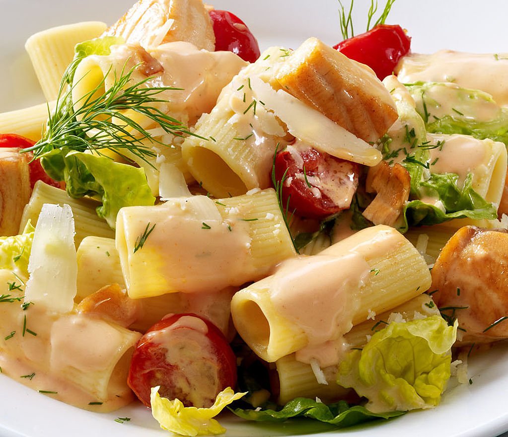 De vis en de tomaten opnieuw toevoegen. De dille wassen, droogschudden (hou nog wat over om als garnituur te gebruiken bij de afwerking), van de steel ontdoen en in fijne stukjes snijden. De pasta afgieten, met sla, dille en de vis-tomatensaus terug in de pan doen. Kort doorroeren. Met parmesanspaanders bestrooien en met dille garneren.