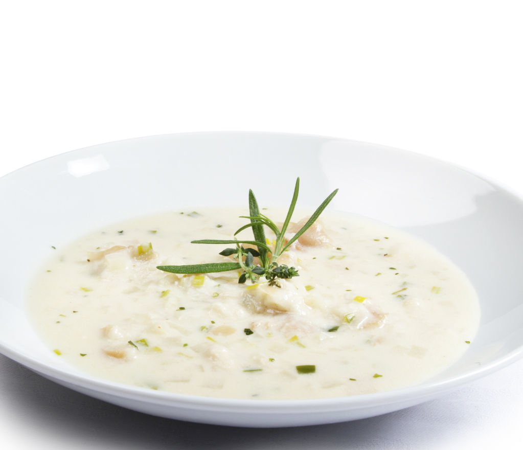 De zoute bretzels klein snijden, ui pellen en in blokjes snijden. Teentjes knoflook pellen en hakken. Selder en prei wassen en in blokjes snijden. Bieslook wassen en fijnsnijden. Tomaten inkerven en 10 seconden lang in kokend water doen, in ijswater schrikken en het vel verwijderen. Het binnenste van de tomaten verwijderen en de tomaten in blokjes snijden. Room en eigeel goed mengen.