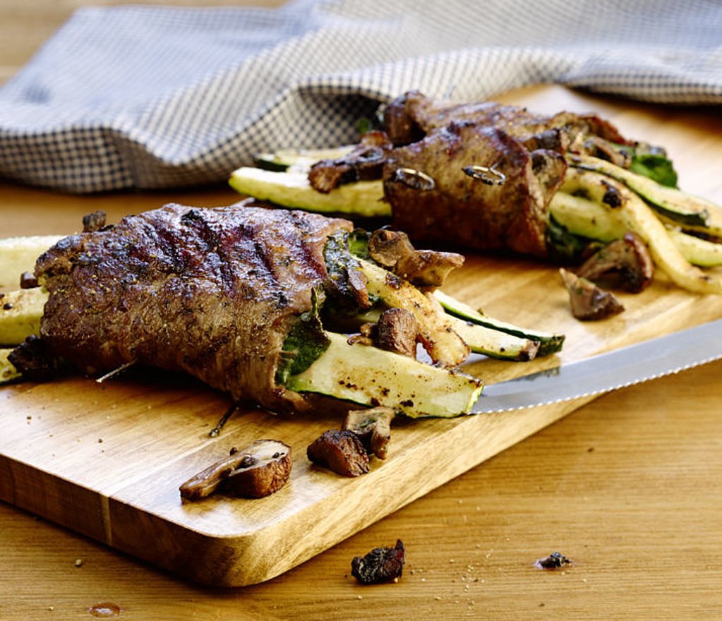 De halve courgette in de lengte in staafjes snijden. De champignons met droog keukenpapier schoonmaken en in schijfjes snijden. De spinaziestengels verwijderen. De groenten samen op de rollade leggen, de kruidenboter er in kleiner stukken op verdelen, inrollen en met een spiesje vaststeken.
