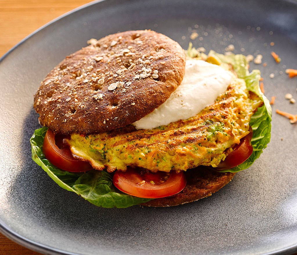 Op basis van deze massa een veggieburger vormen en aan beide zijden krokant grillen.